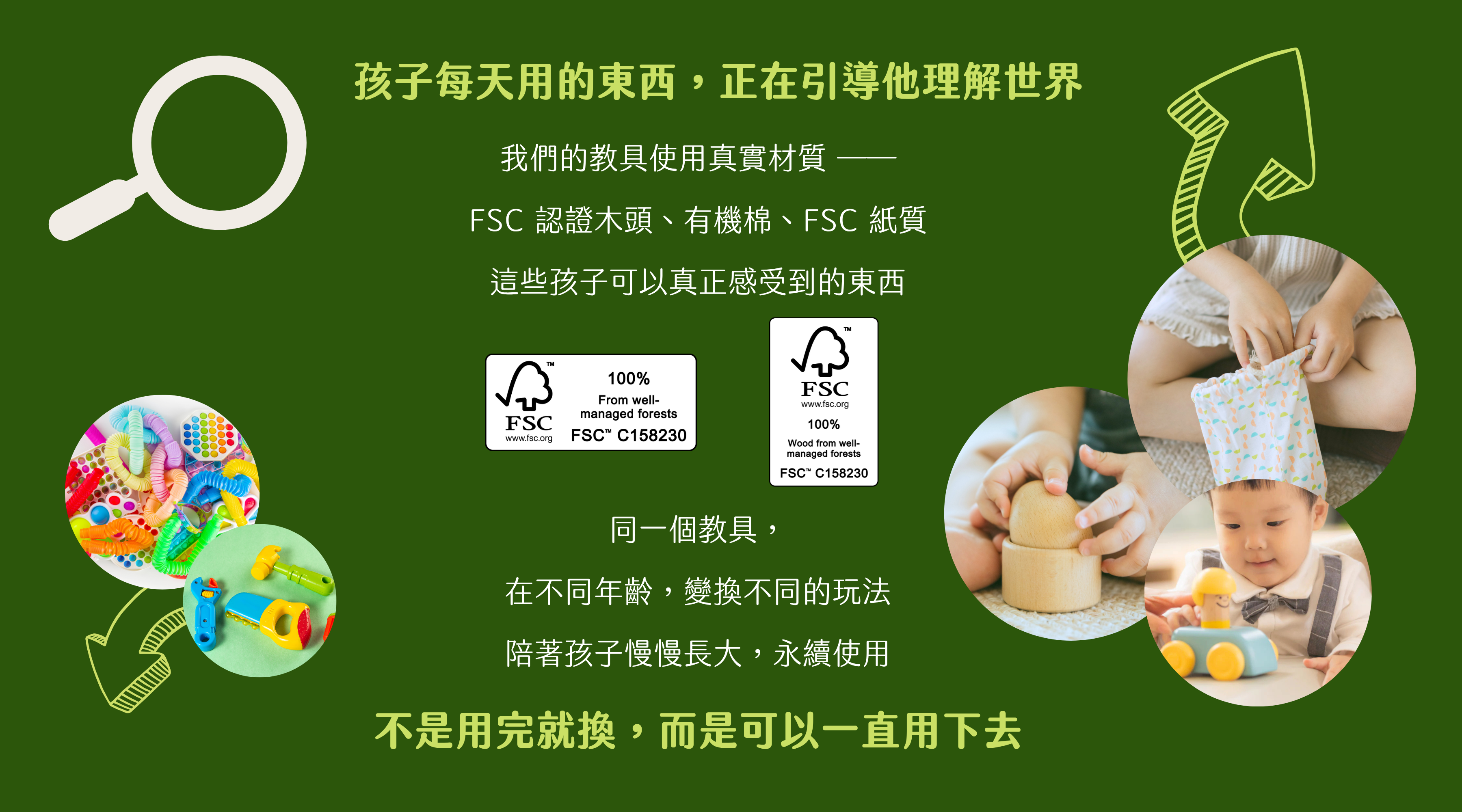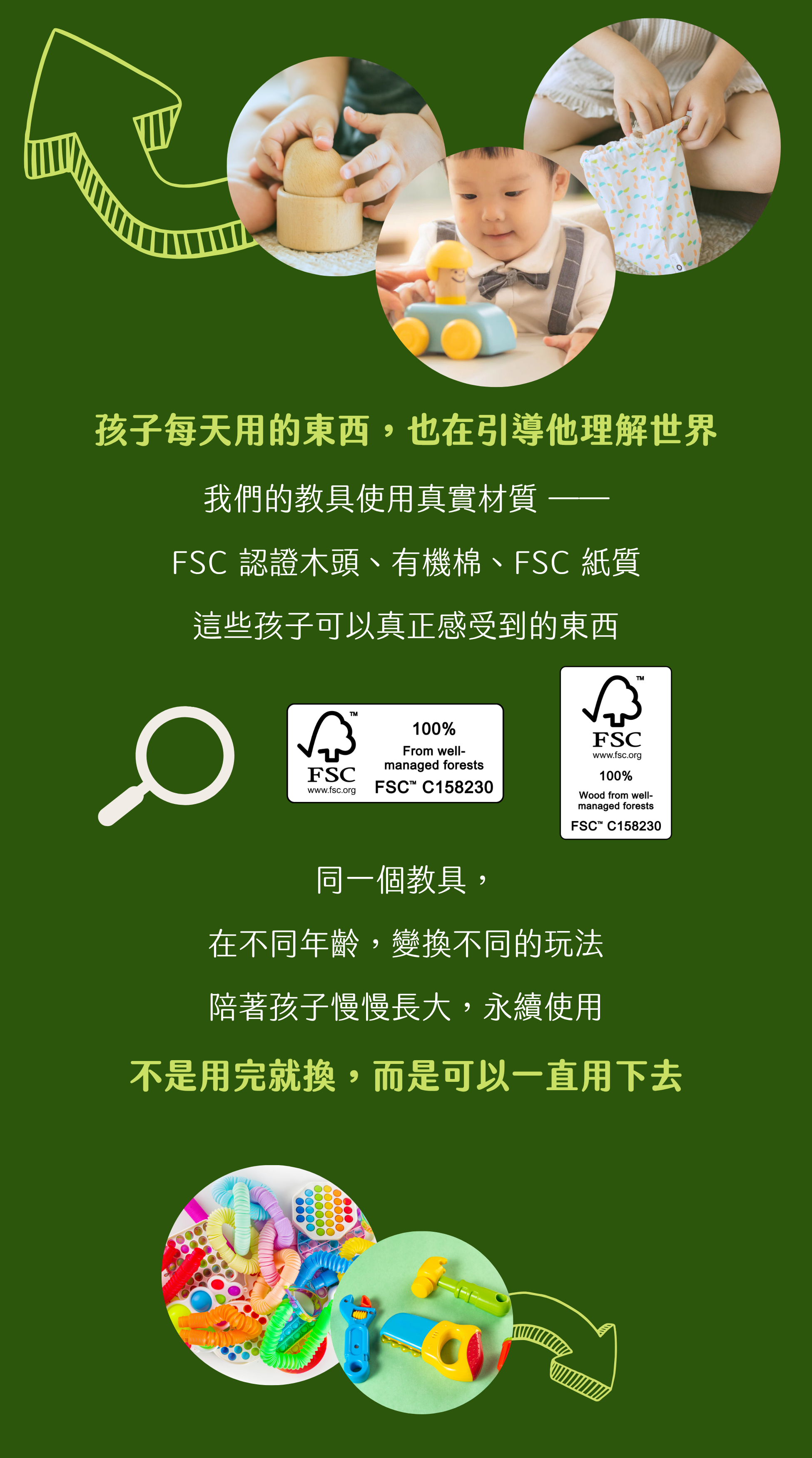 少一點包裝,多一點被使用 每年地球日,我都會想一件很簡單的事: 我們讓孩子用的東西,會陪他多久? 永續這件事,對我們來說,其實不是現在才開始想的。 2023 年時,我寫下了這篇文章 【世界地球日】 愛地球不只有環境保護,你與我在日常可以實踐的SDGs 慶幸的是,三年過去,我們仍然在地球日的這個月,執筆寫下新的一篇。 Circle by Circle 創立的第一天,甚至在設計第一個教具的那張圖紙上,這件事就已經在裡面了。 我們沒有特別把它當成一個「主題」,只是很自然地在每一個選擇裡問自己: 這個東西,能不能給予孩子真實的生活體驗?會不會被好好使用?會不會陪孩子一段時間? 這一次,我們沒有做一個很「環保」的活動。只是把焦點,放回教具本身。 不是它看起來多完整,而是它能不能真的走進孩子的生活裡。 對我們來說,永續有兩件事 這幾年在做教具,我慢慢發現,我們在意的永續,其實很單純。 1. 孩子摸到的是什麼(真實材質) 木頭、有機棉、金屬、紙——還是塑膠? 孩子每天接觸的東西,其實正在慢慢告訴他:這個世界是什麼樣子。 重量、溫度、觸感,這些細微的差異,都會被記住。 所以我們一直很堅持,讓教具回到真實材質。不只是因為它比較「天然」,也還因為它比較「真實」。 永續對我們來說,不是後面才加進來的東西。 而是在設計、在做產品的時候,就會一直出現的一個問題。 我們一直在想:這個材質是什麼?孩子會怎麼感覺到它?它能帶來什麼樣的認知學習? 所以在教具產製上,我們用高的標準在做選擇: 木製教具,使用 FSC™ 森林認證的木材;紙製教具,選擇 FSC™ 森林認證的紙漿。 我相信,如果有越來越多人做出這樣的選擇,某種程度上,也是在用一個很日常的方式,慢慢做出一些改變。 我們也盡量讓孩子接觸的是「接近原本樣子」的材質——像是木頭、紙、棉布、羊毛氈、不鏽鋼。 而不是太多加工之後、變得很一致的材料。 不是說哪一種一定比較好,而是這些材質,本來就有差異。 讓孩子真的去摸、去感受這些不同、去發現原來重量、速度會帶來不同的因果關係, 這就是在學習。 從很小的時候開始,他就在用自己的方式認識世界。 2. 這個教具會被用多久(長時間使用) 我們時常在想—— 如何在分齡的設計下,還能讓教具陪伴孩子更久? 所以,我們設計出:同一個教具,會隨著孩子的成長慢慢改變玩法。 6個月、9個月、2歲,從抓握、操作,到想像與說故事,它不會只停留在一個階段。 如果一個東西,可以一直被使用,那它本身,就已經是一種很自然的永續。 但對我來說,這件事其實不只停在「一個教具」。 慢慢地,我會把它想成一個更大的東西——一個以家庭為核心的學習與陪伴系統。...