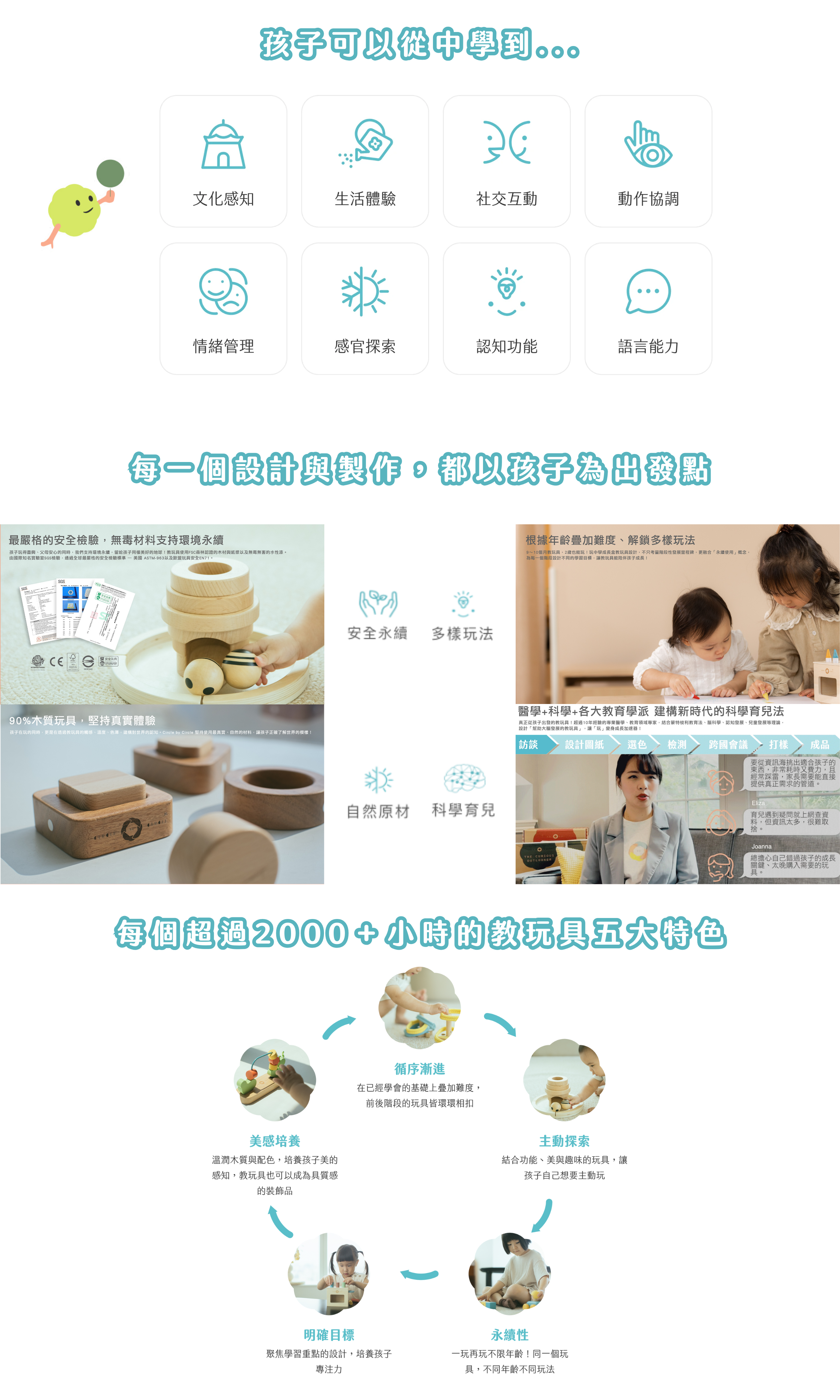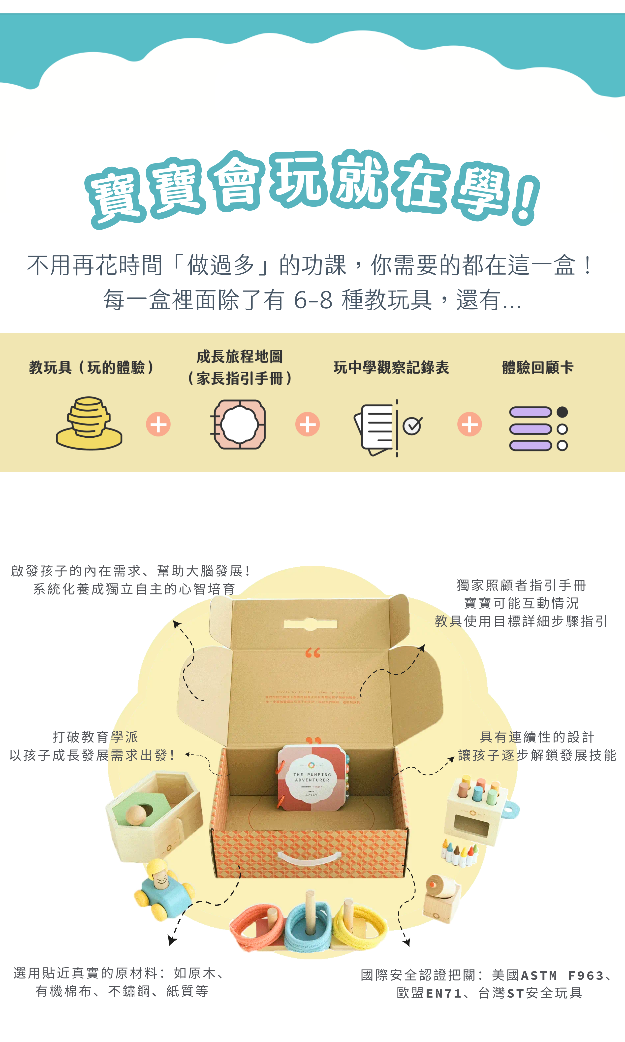 採用 FSC 森林認證木材、有機棉布等環保材質,通過 ASTM F963、EN71 及台灣 ST 安全玩具認證,由教育與醫學專家攜手設計,兼顧創意與實用性。