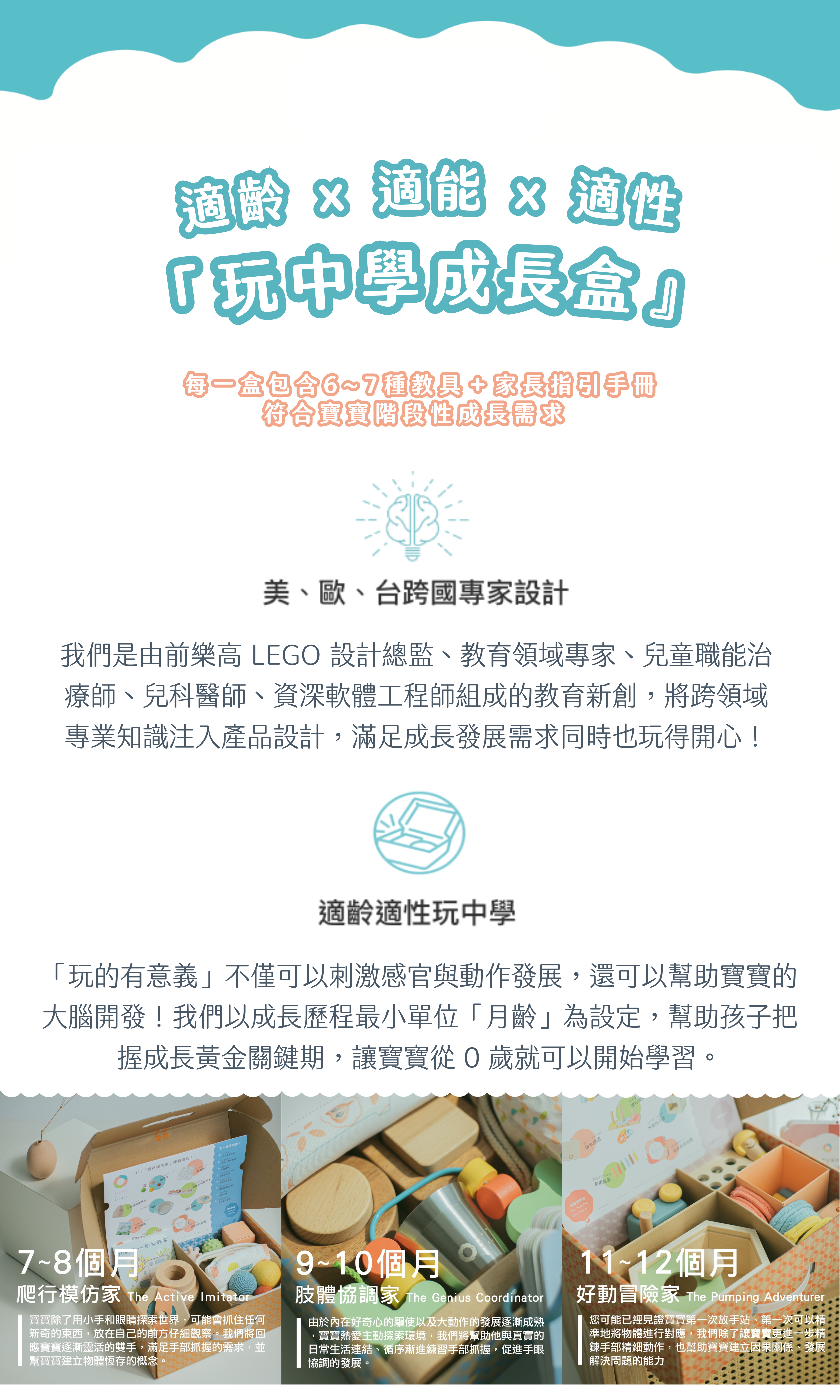 嘖嘖募資上市破百萬,玩中學成長盒 是台灣首個專為嬰幼兒設計的分齡教育品牌,結合醫學與教育專家10年以上經驗,針對不同月齡打造適合的學習體驗。盒內包含 6~7 組教具及專家編撰的家長指引手冊,陪伴寶寶在遊戲中學習、在探索中成長。